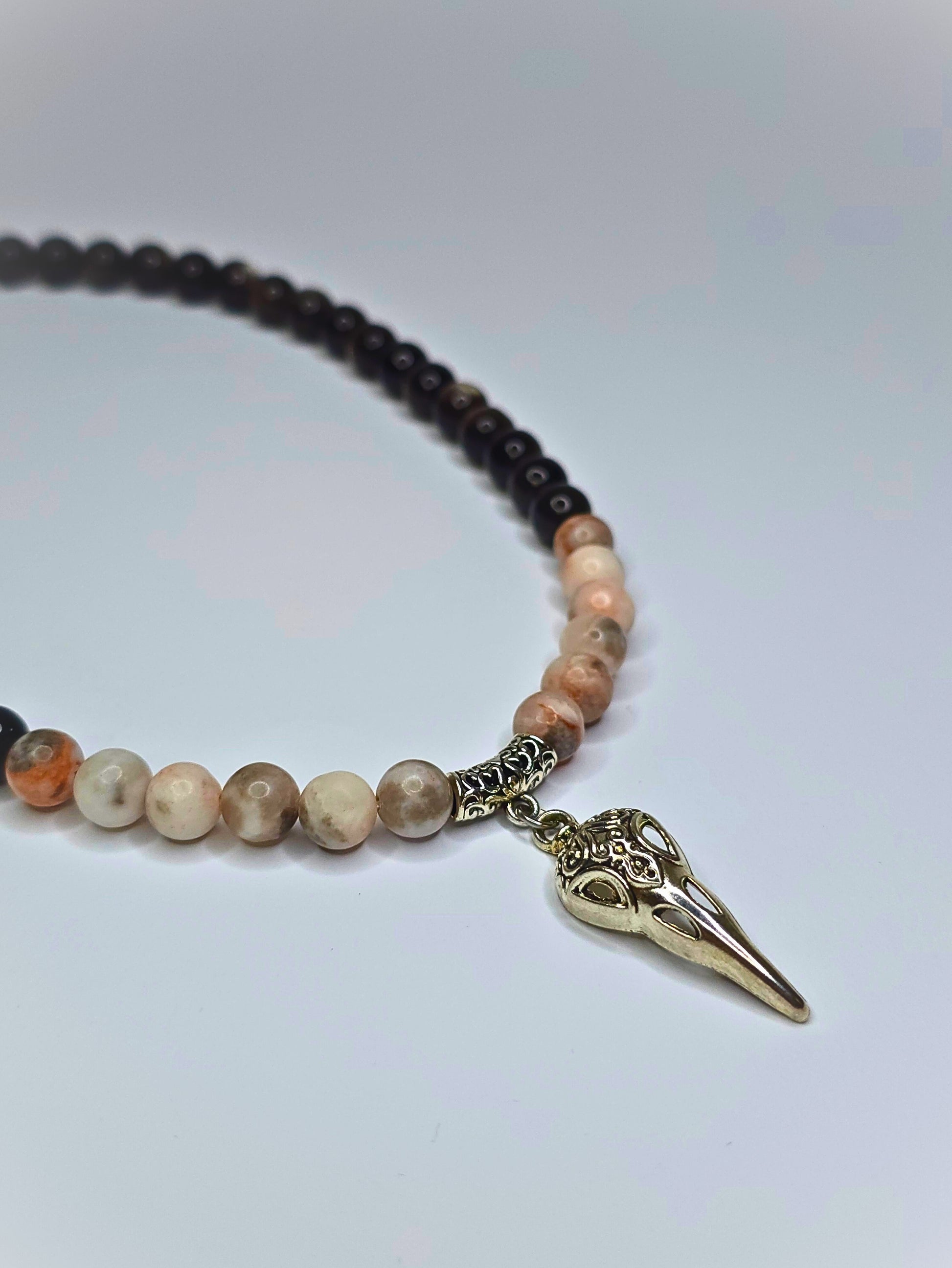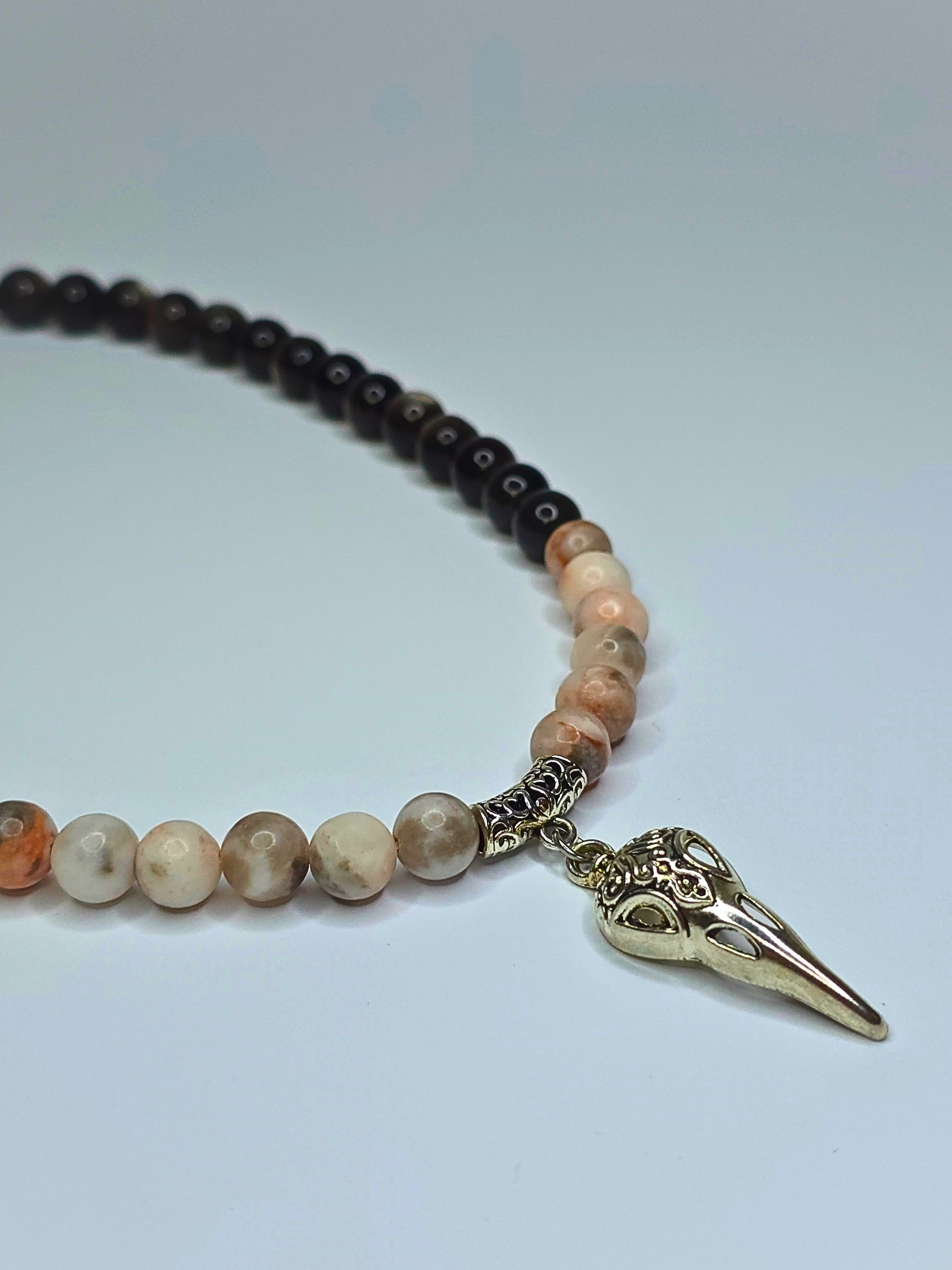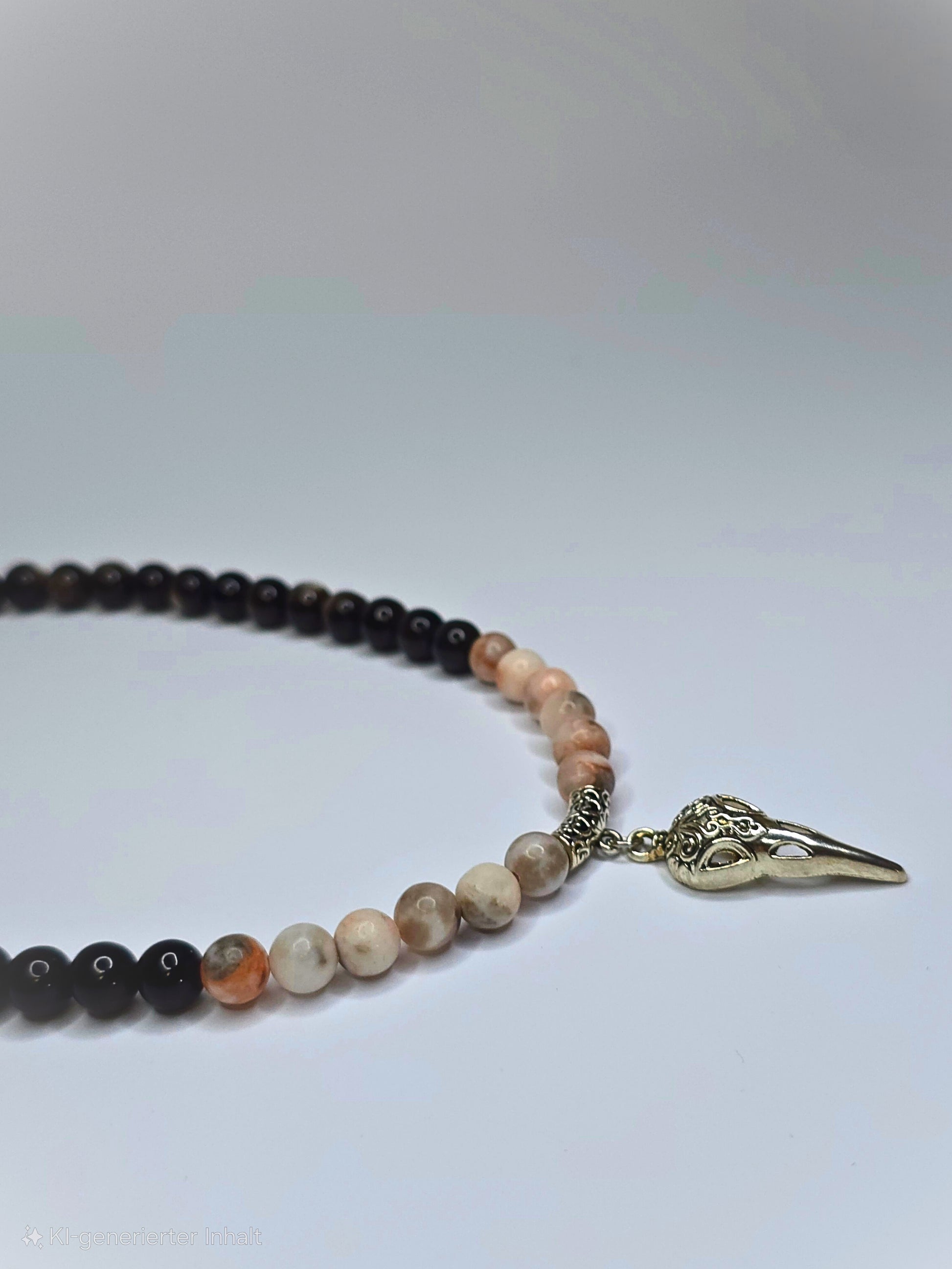 Halskette kombiniert mattierte Natursteinperlen in warmen Beige- und Brauntönen mit tiefschwarzen Akzenten. Im Mittelpunkt steht ein filigraner Rabenschädel-Anhänger aus Metall im Vintage-Look. Ein Unisex-Statement. Spirituelle und Stilvolle vereinen wollen.
