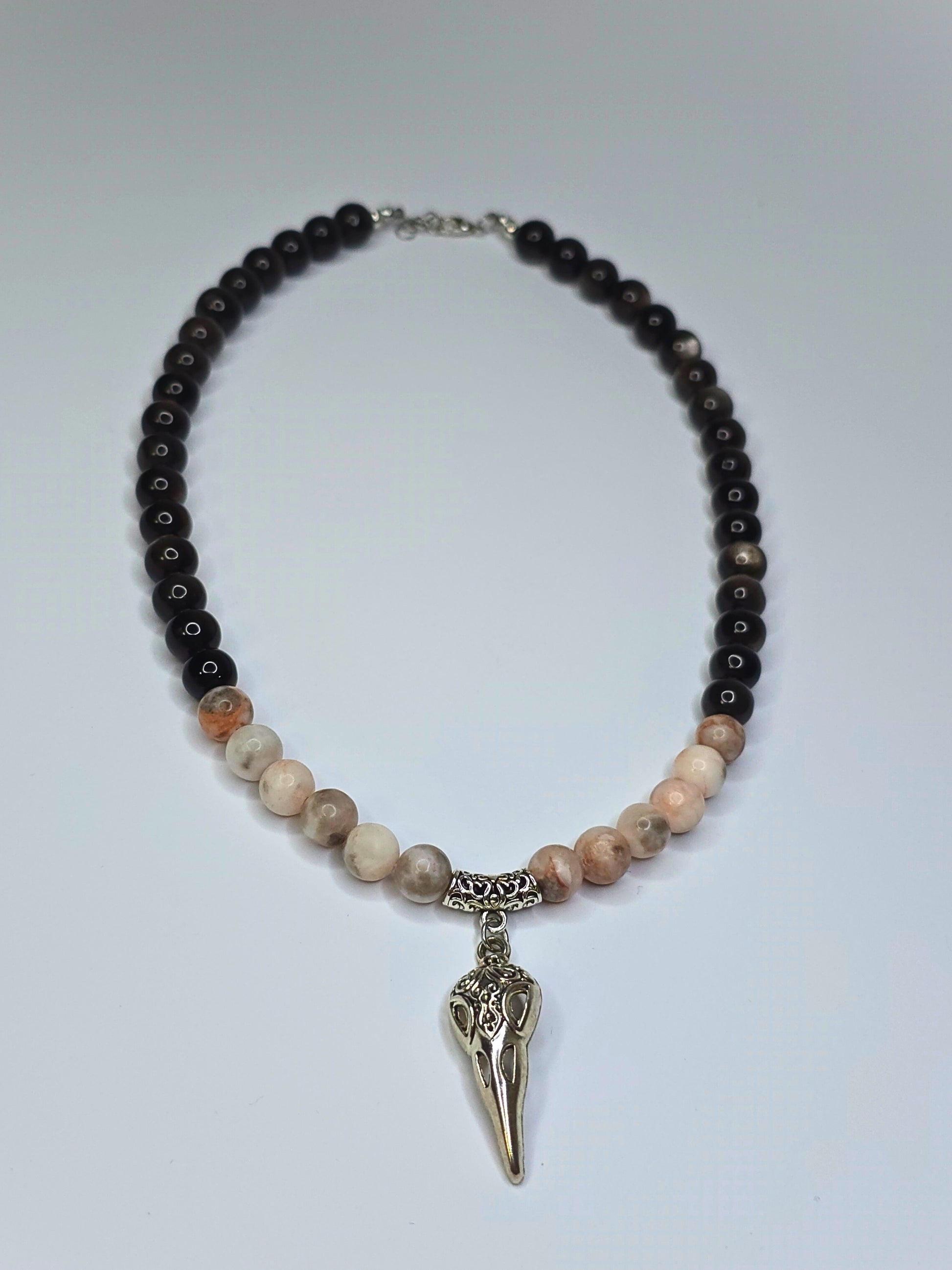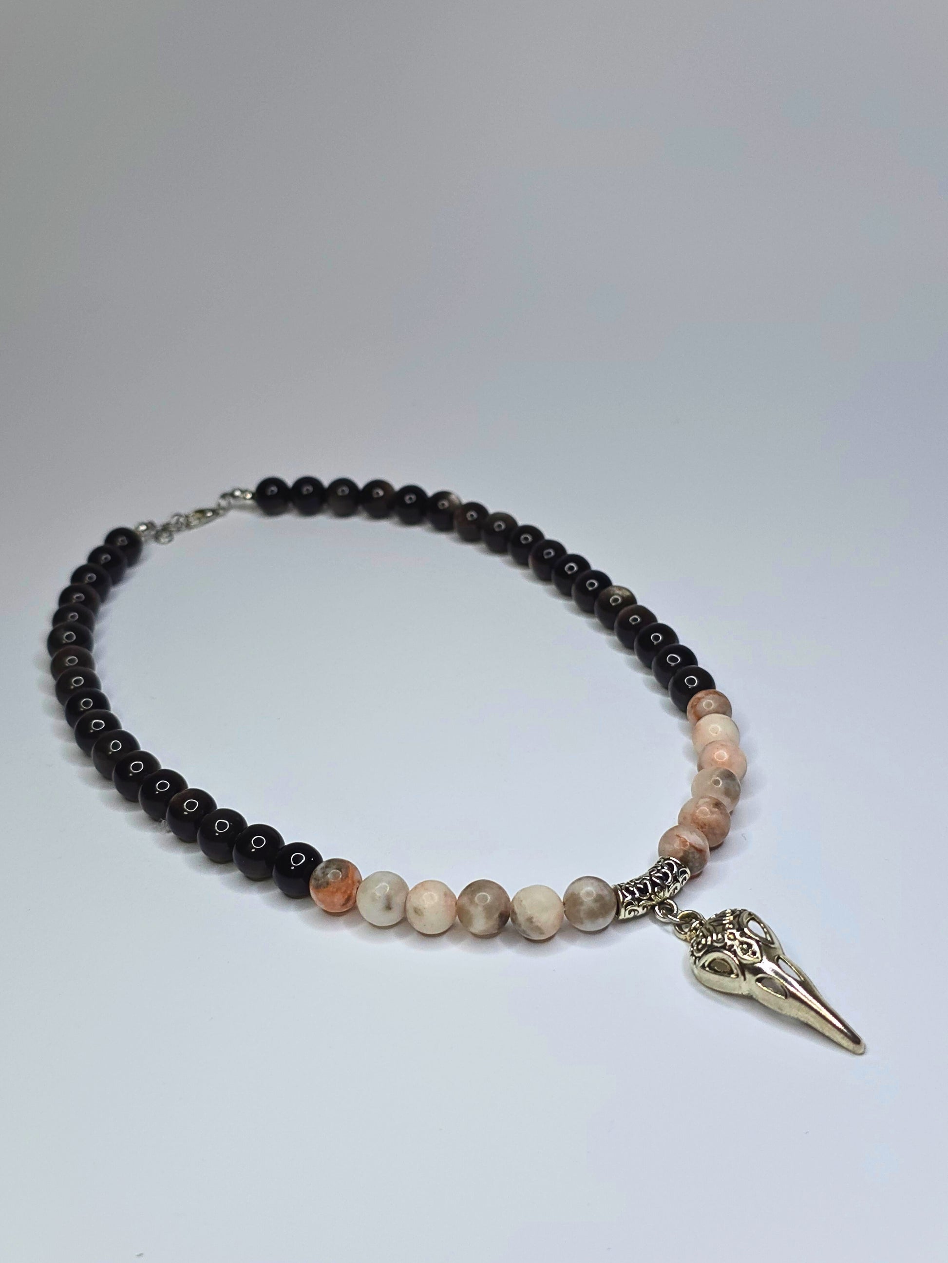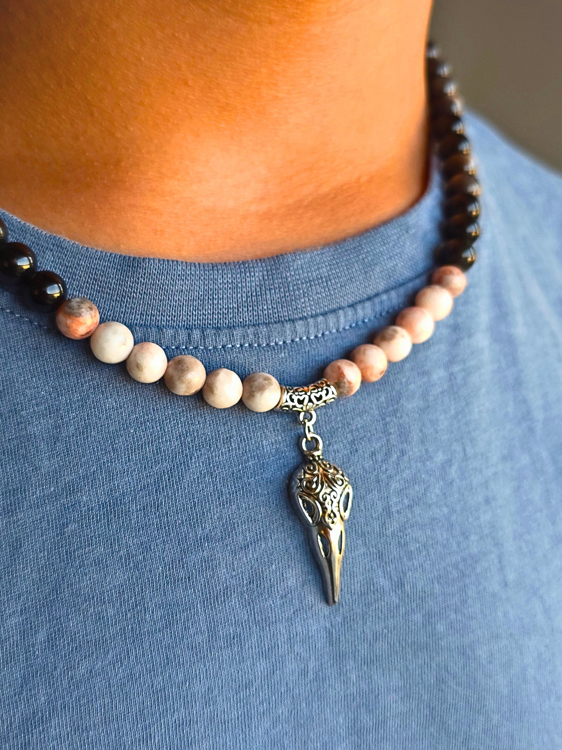 Halskette kombiniert mattierte Natursteinperlen in warmen Beige- und Brauntönen mit tiefschwarzen Akzenten. Im Mittelpunkt steht ein filigraner Rabenschädel-Anhänger aus Metall im Vintage-Look. Ein Unisex-Statement. Spirituelle und Stilvolle vereinen wollen.
