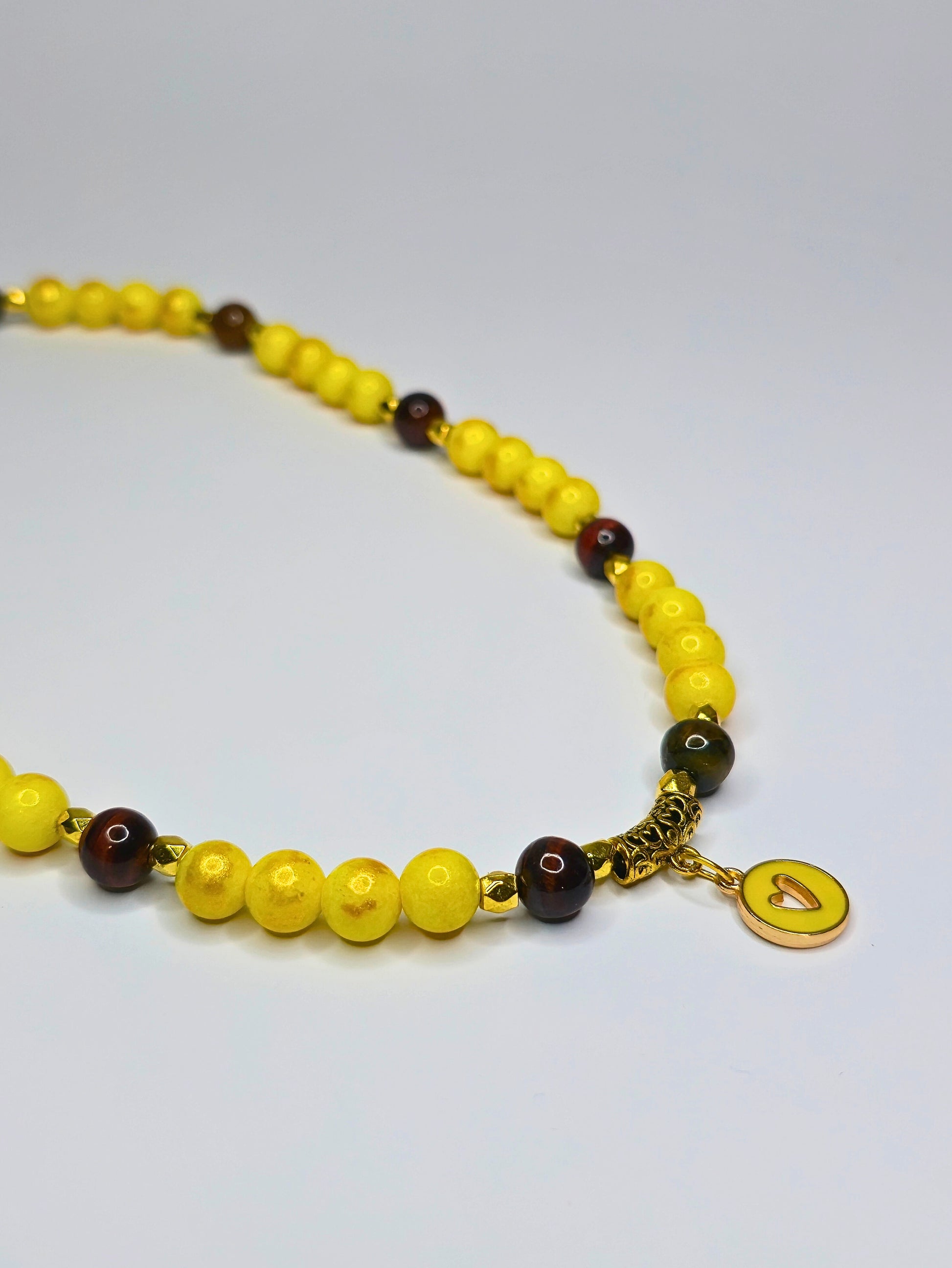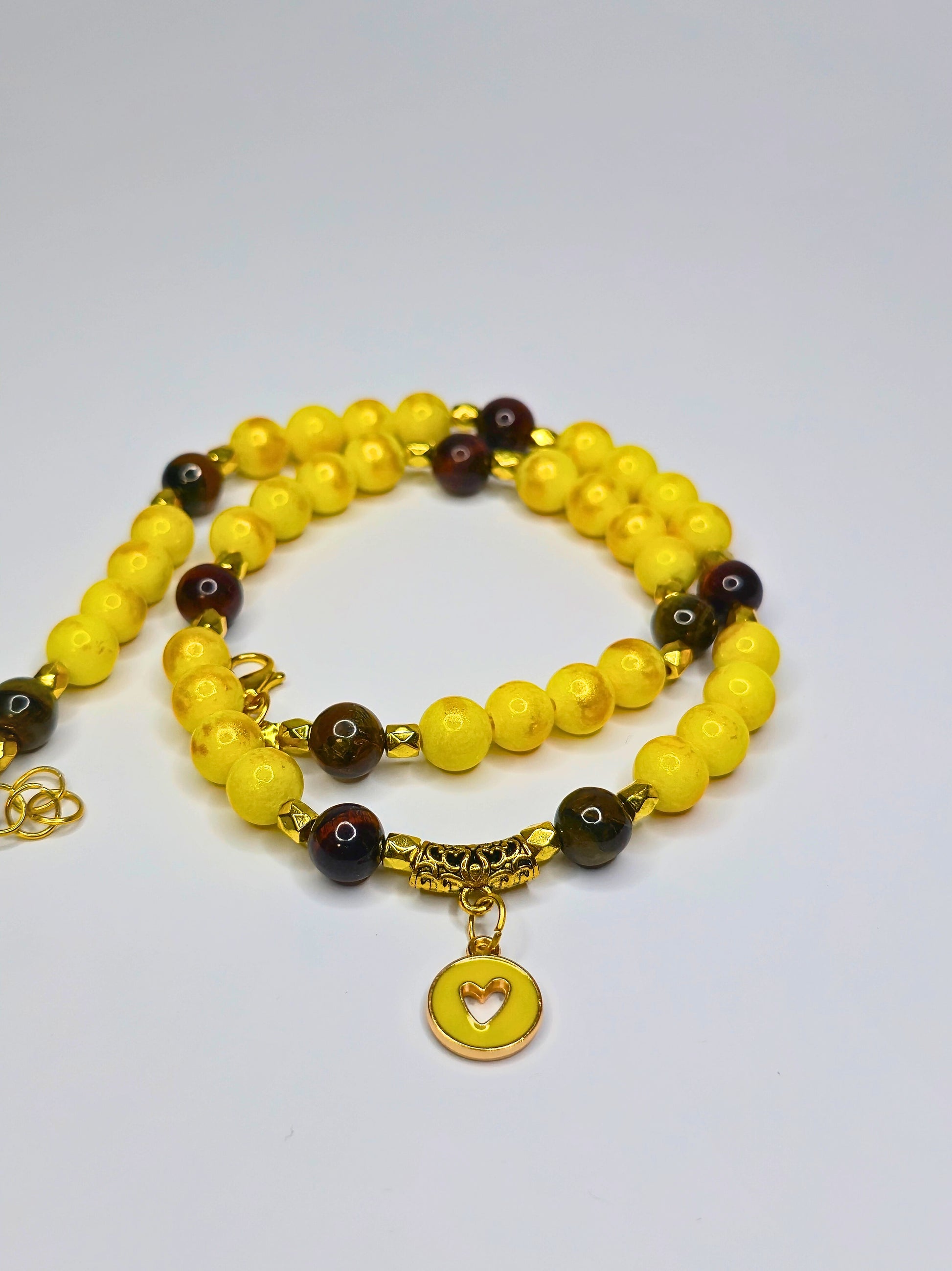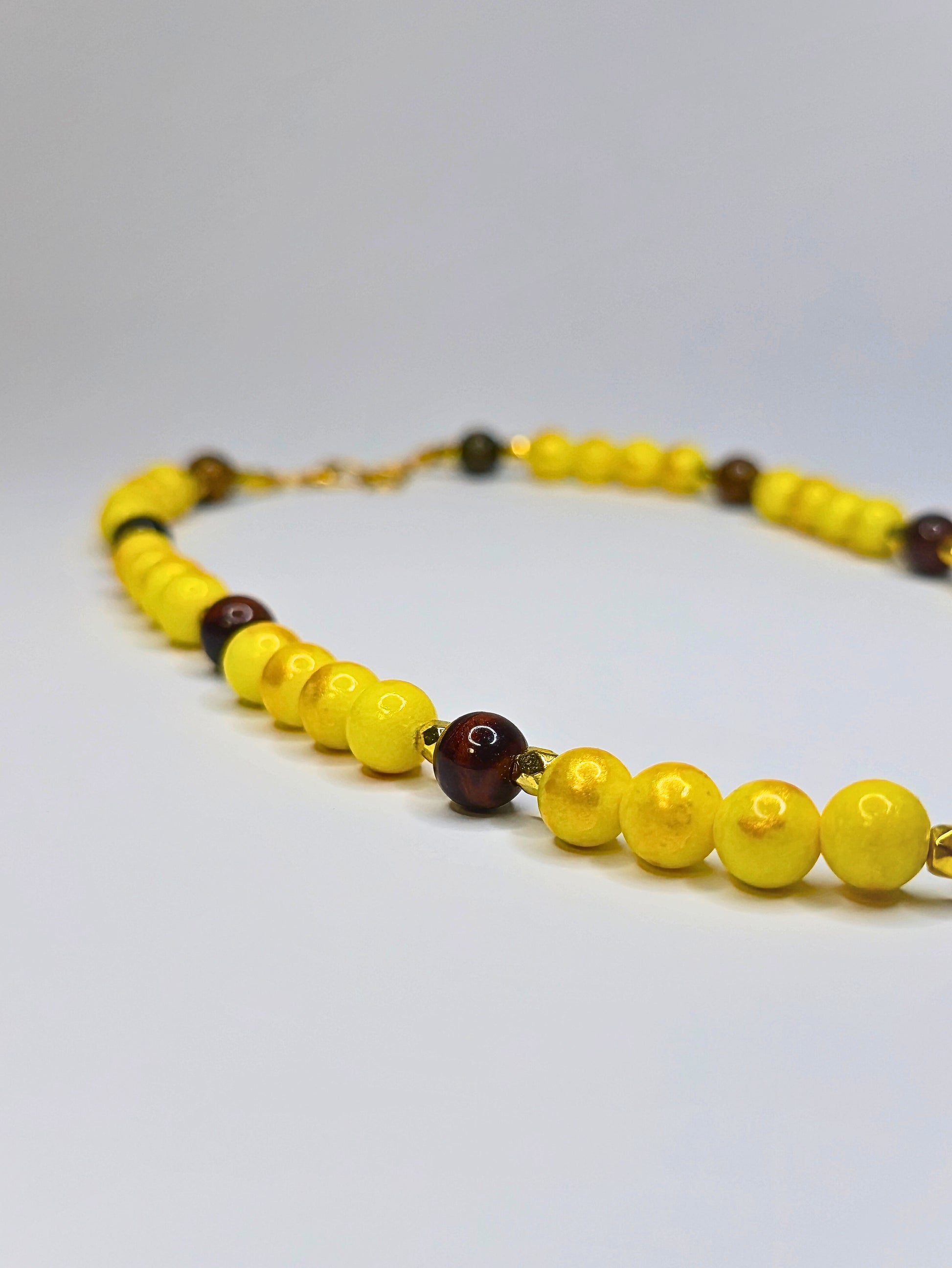 Diese Halskette ist ein echter Blickfang: Leuchtend gelbe Perlen in Kombination mit dunklen Akzenten und goldfarbenen Zwischenteilen verleihen ihr eine warme, lebendige Ausstrahlung.