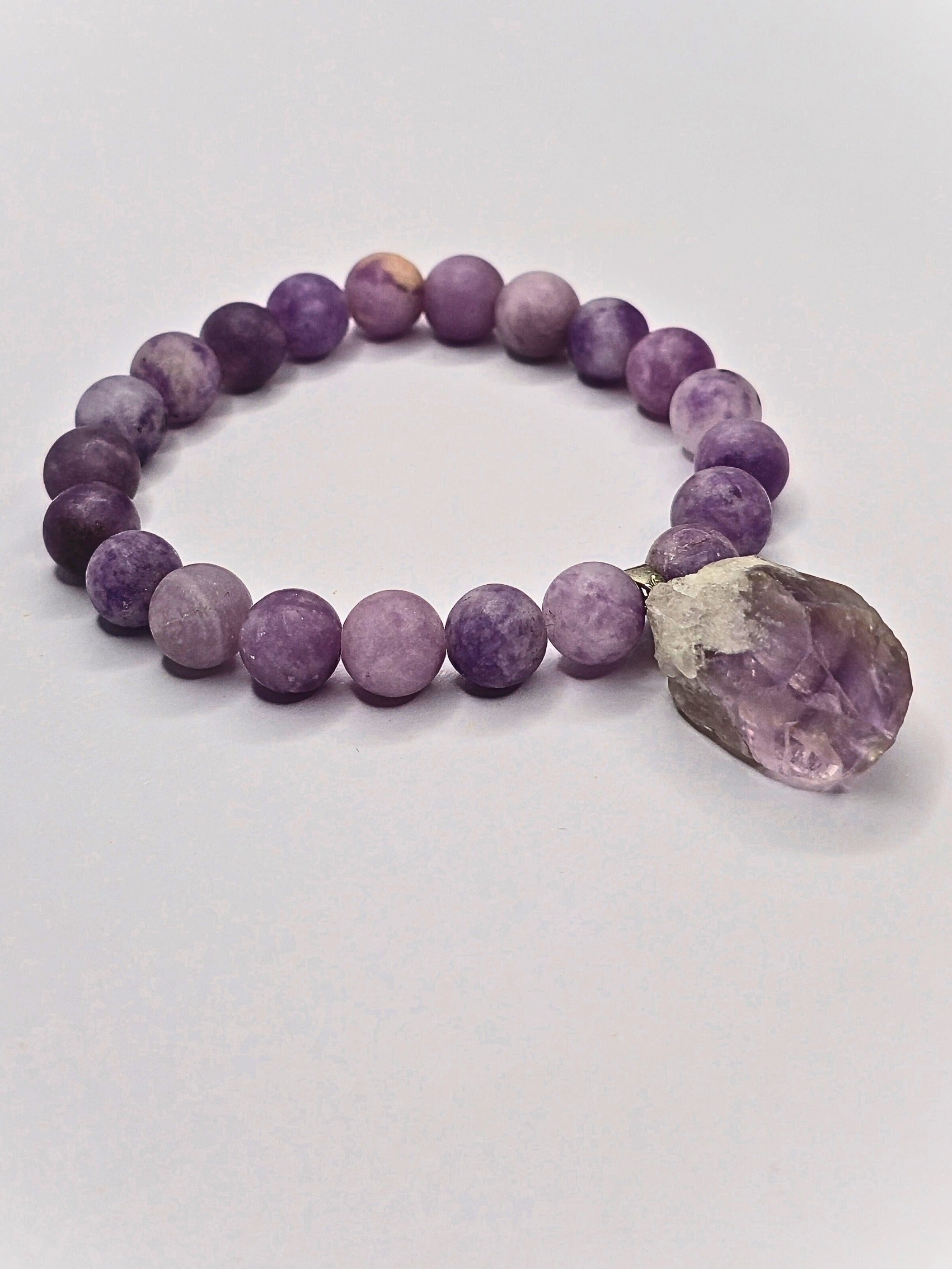Das "Mystic Amethyst" Armband kombiniert natürliche Eleganz mit spiritueller Energie. Die sanft matten Perlen in zarten Violetttönen harmonieren perfekt mit dem auffälligen Rohstein-Anhänger, ein echter Blickfang mit besonderer Ausstrahlung.