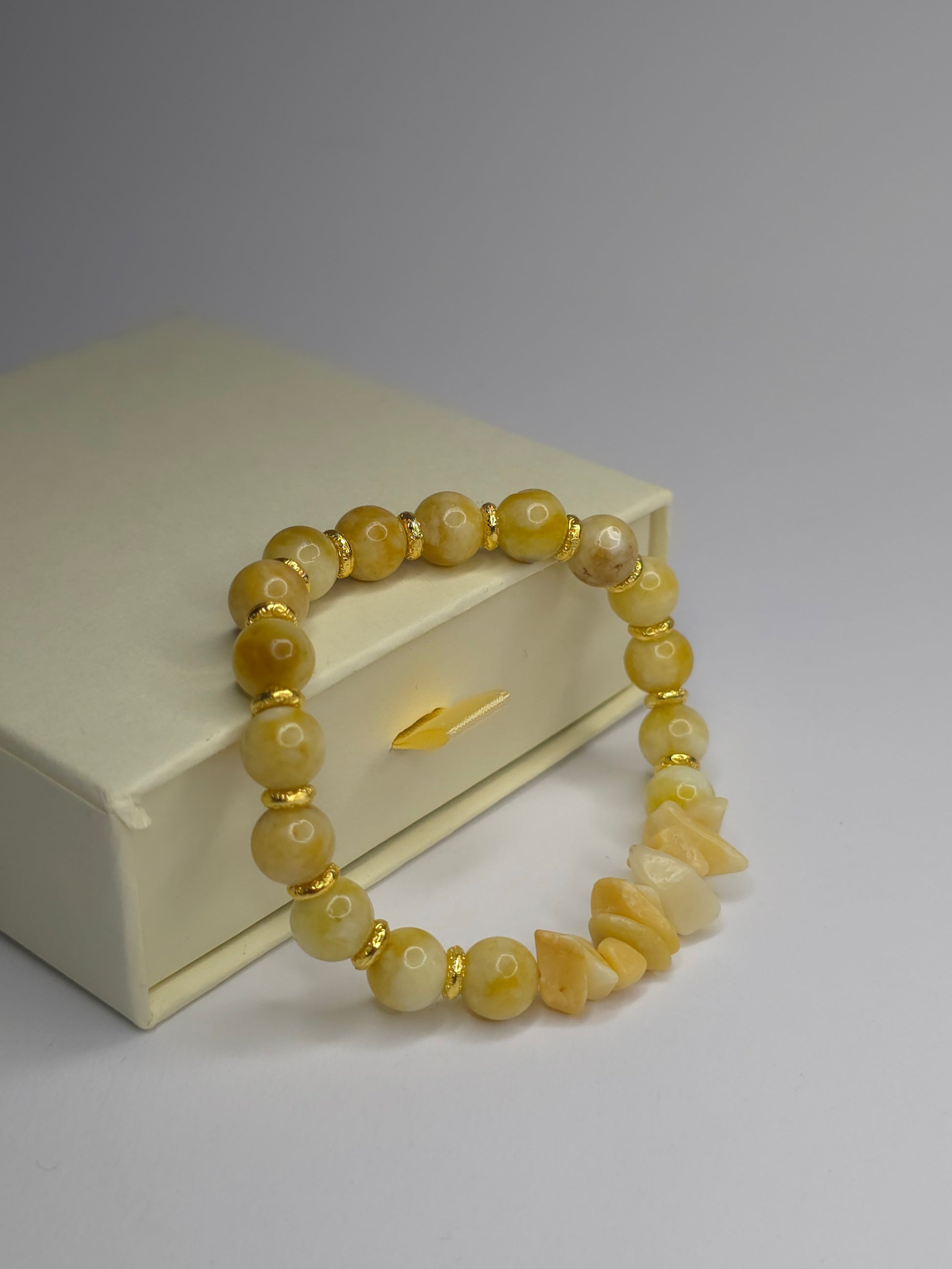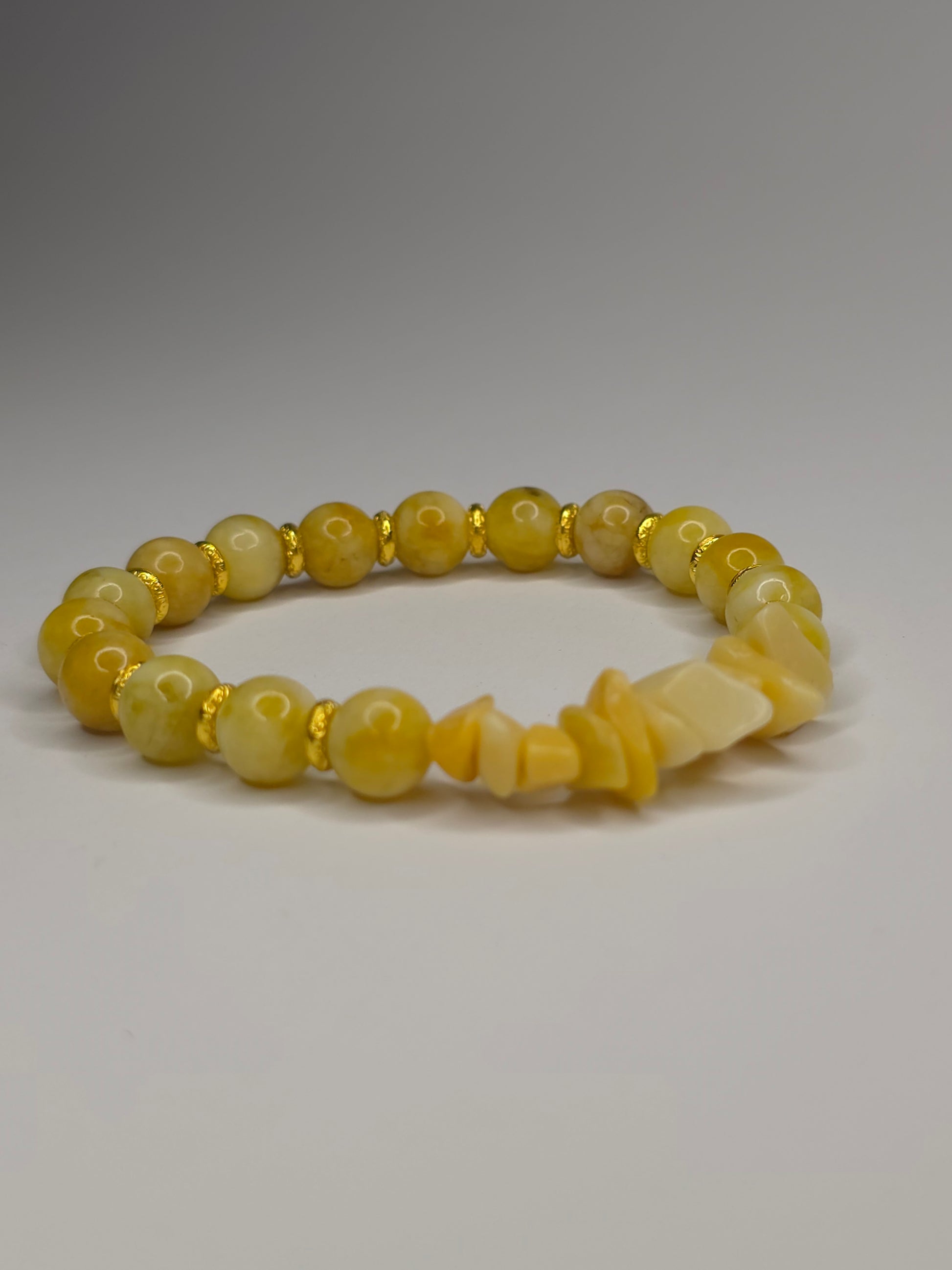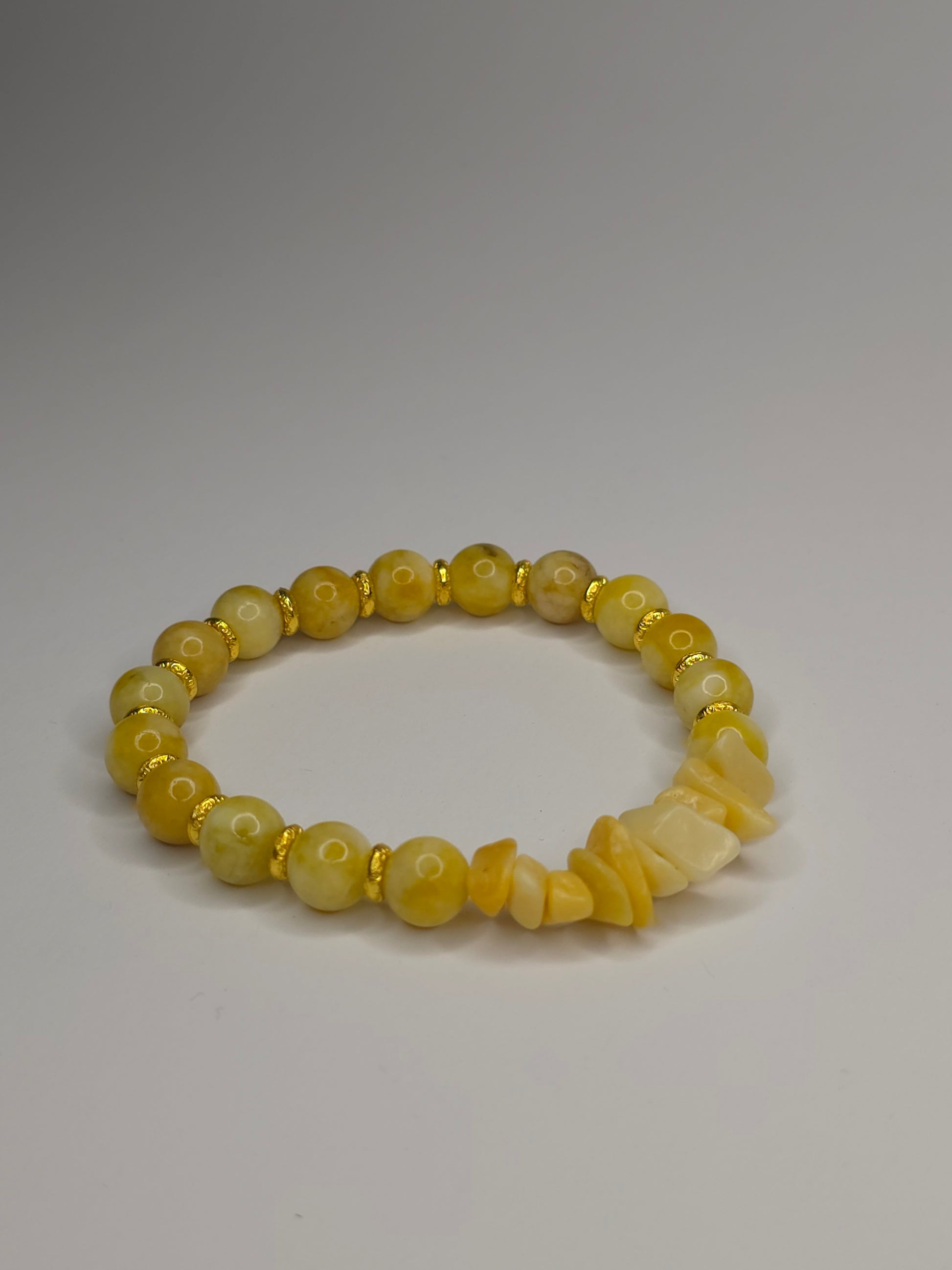 Umfassen Sie die Wärme der Sonne mit unserem Armband Sonnen-Elixier. Dieses handgefertigte Schmuckstück strahlt eine positive Energie aus, die durch die Kombination von glänzenden, runden Perlen aus gelbem Achat und rohen, unbehandelten Steinsplittern aus gelbem Jade entsteht.
