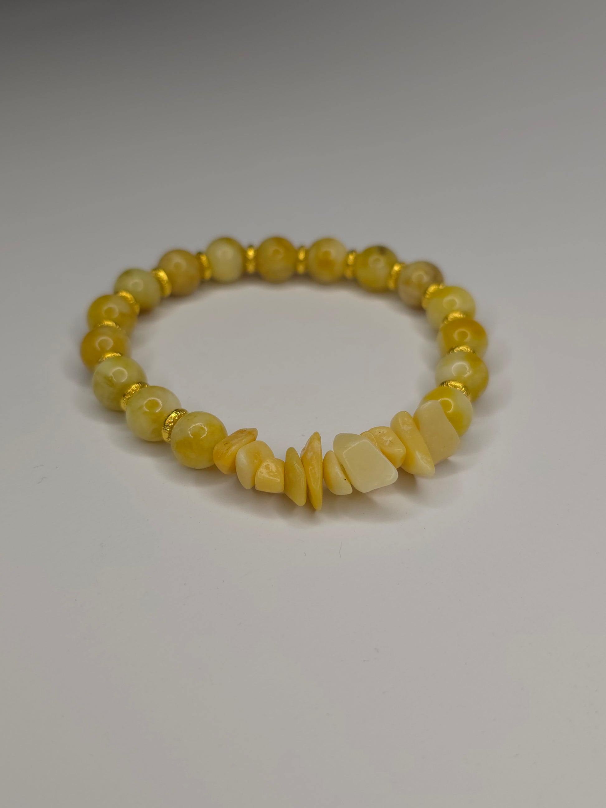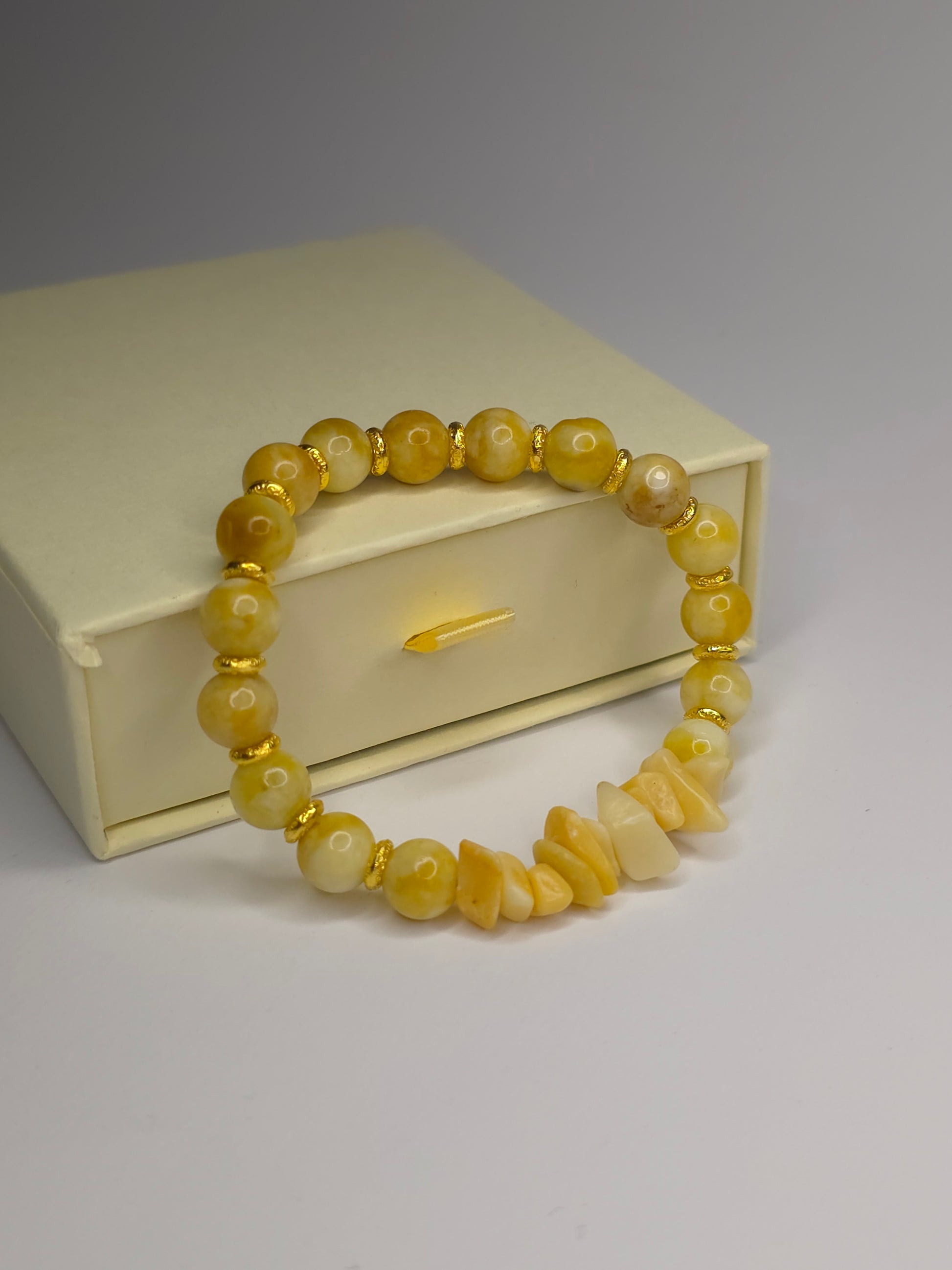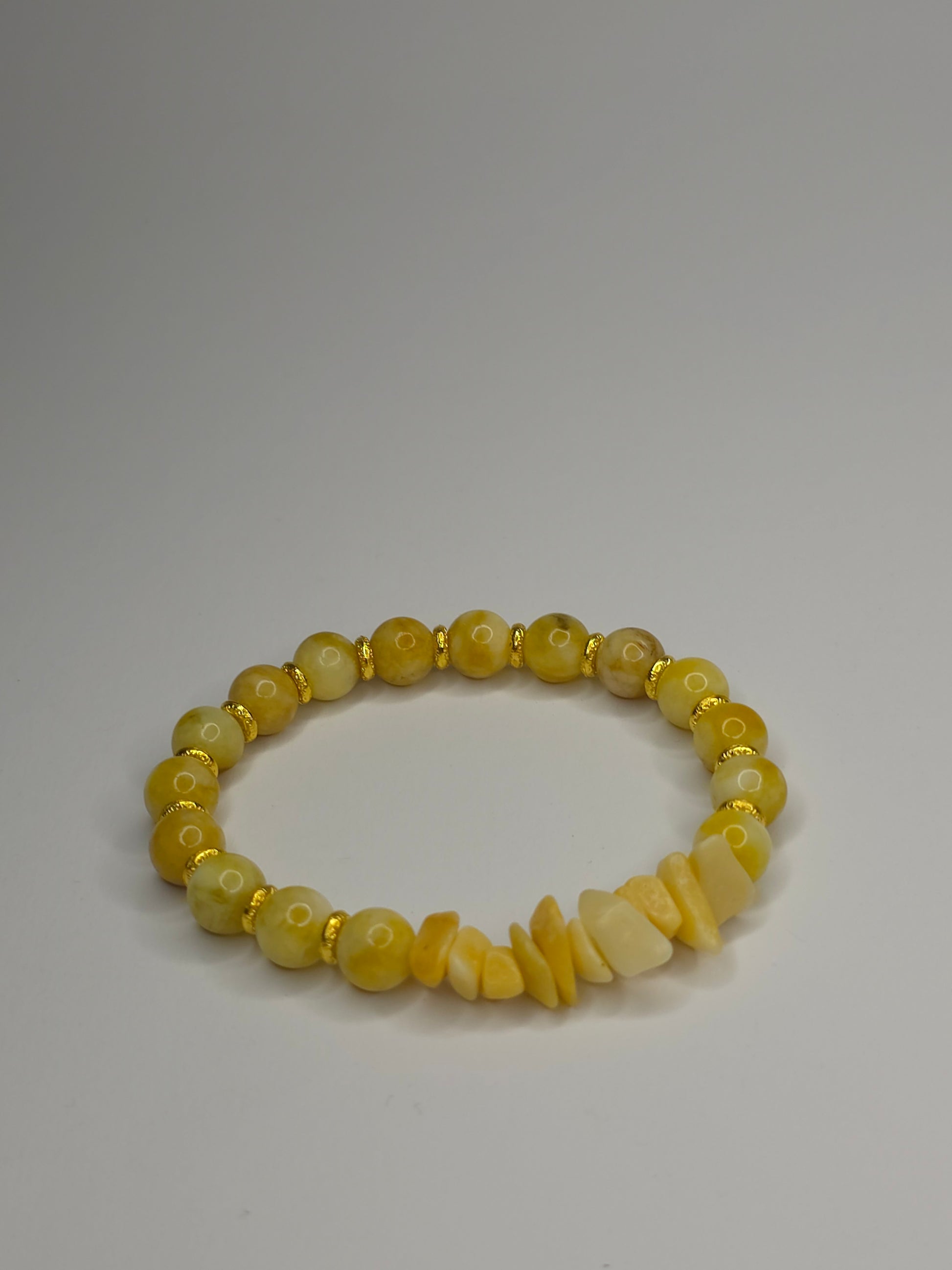 Umfassen Sie die Wärme der Sonne mit unserem Armband Sonnen-Elixier. Dieses handgefertigte Schmuckstück strahlt eine positive Energie aus, die durch die Kombination von glänzenden, runden Perlen aus gelbem Achat und rohen, unbehandelten Steinsplittern aus gelbem Jade entsteht.