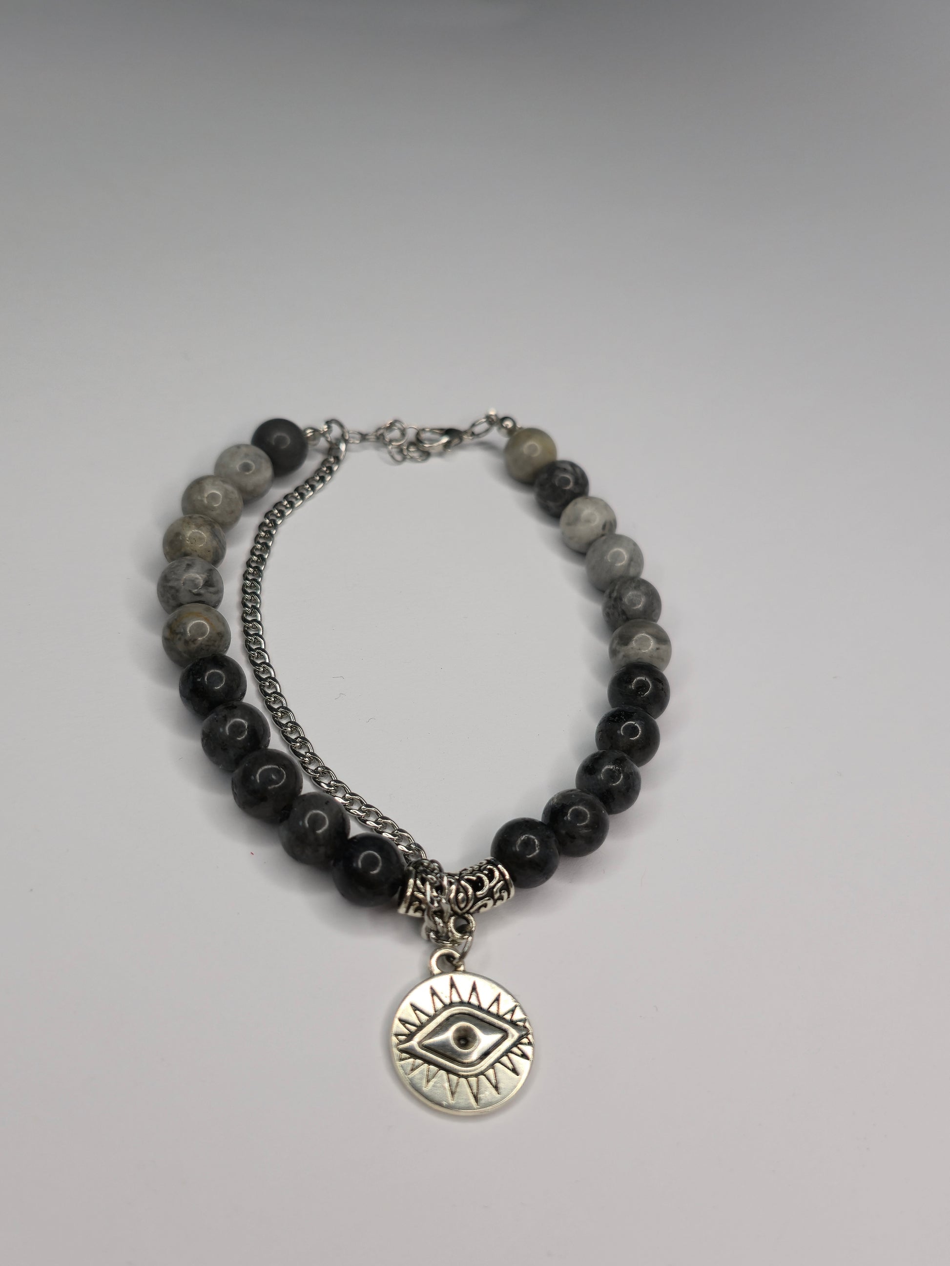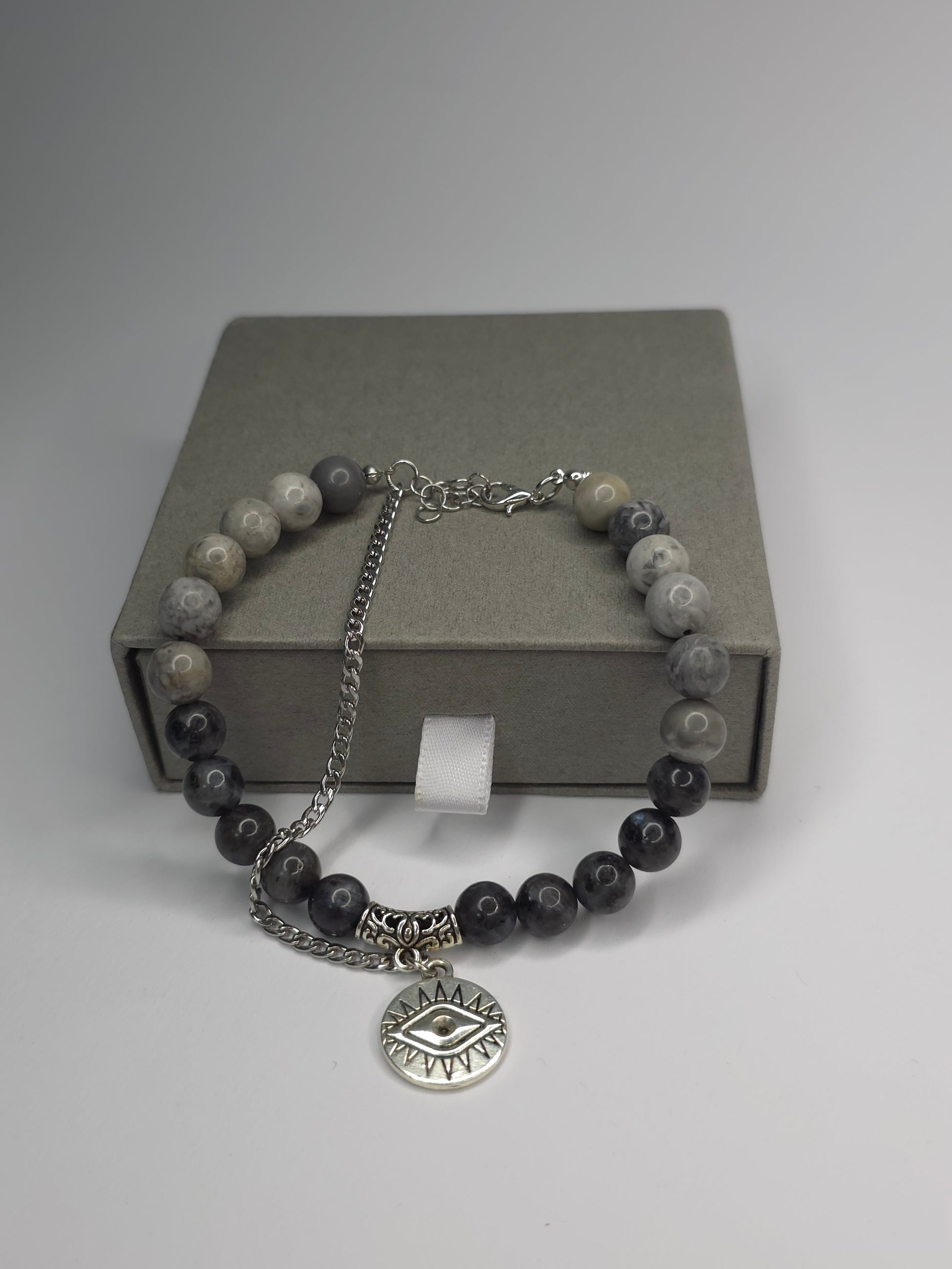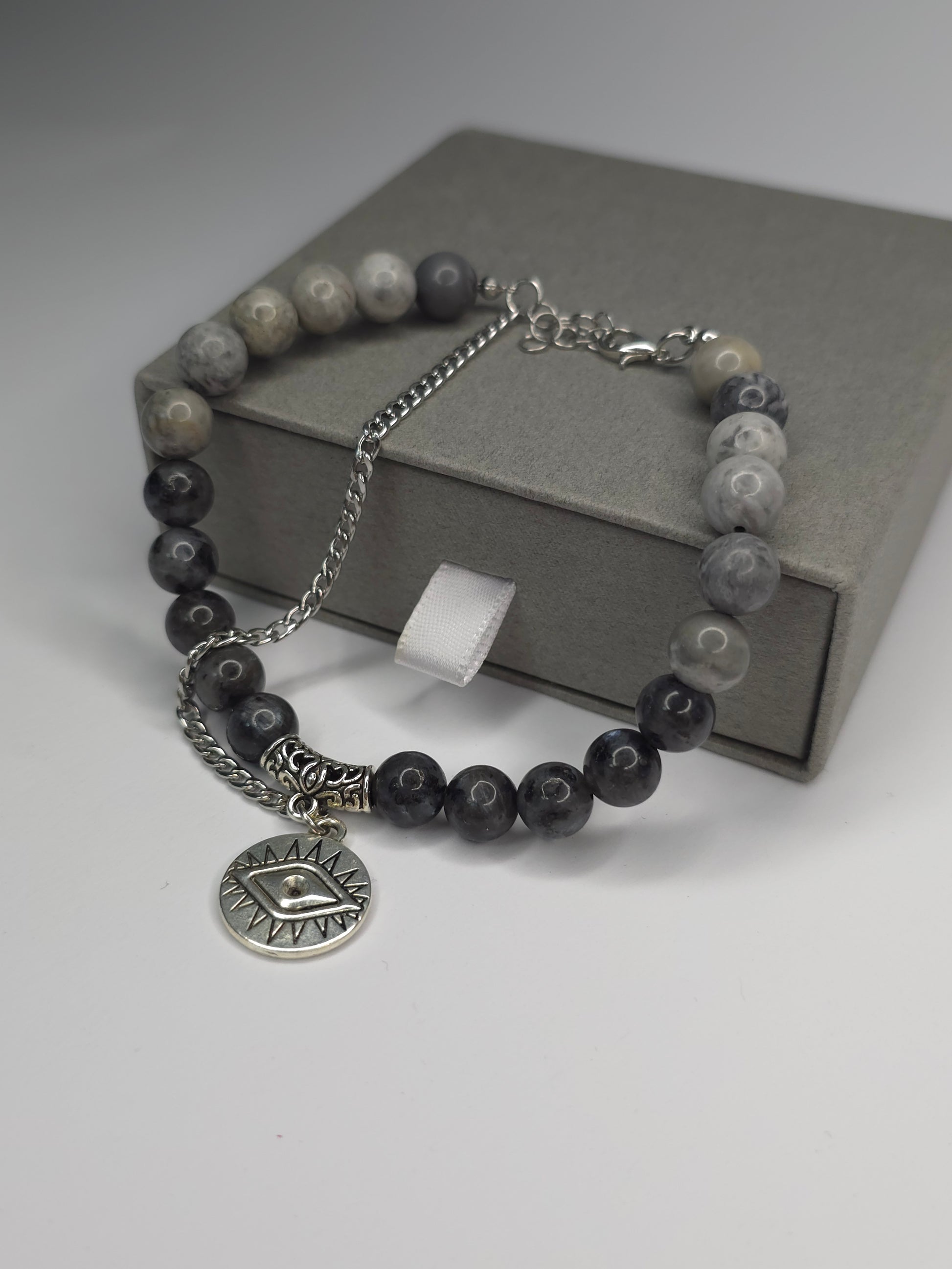 Mystic Eyein ist ein einzigartiges Armband aus polierten Natursteinperlen in Grautönen, kombiniert mit kunstvoll verzierten Silberelementen. Im Mittelpunkt steht ein runder Anhänger mit dem Symbol des schützenden Auges-ein zeitloses Zeichen für Energie, Achtsamkeit und Balance.