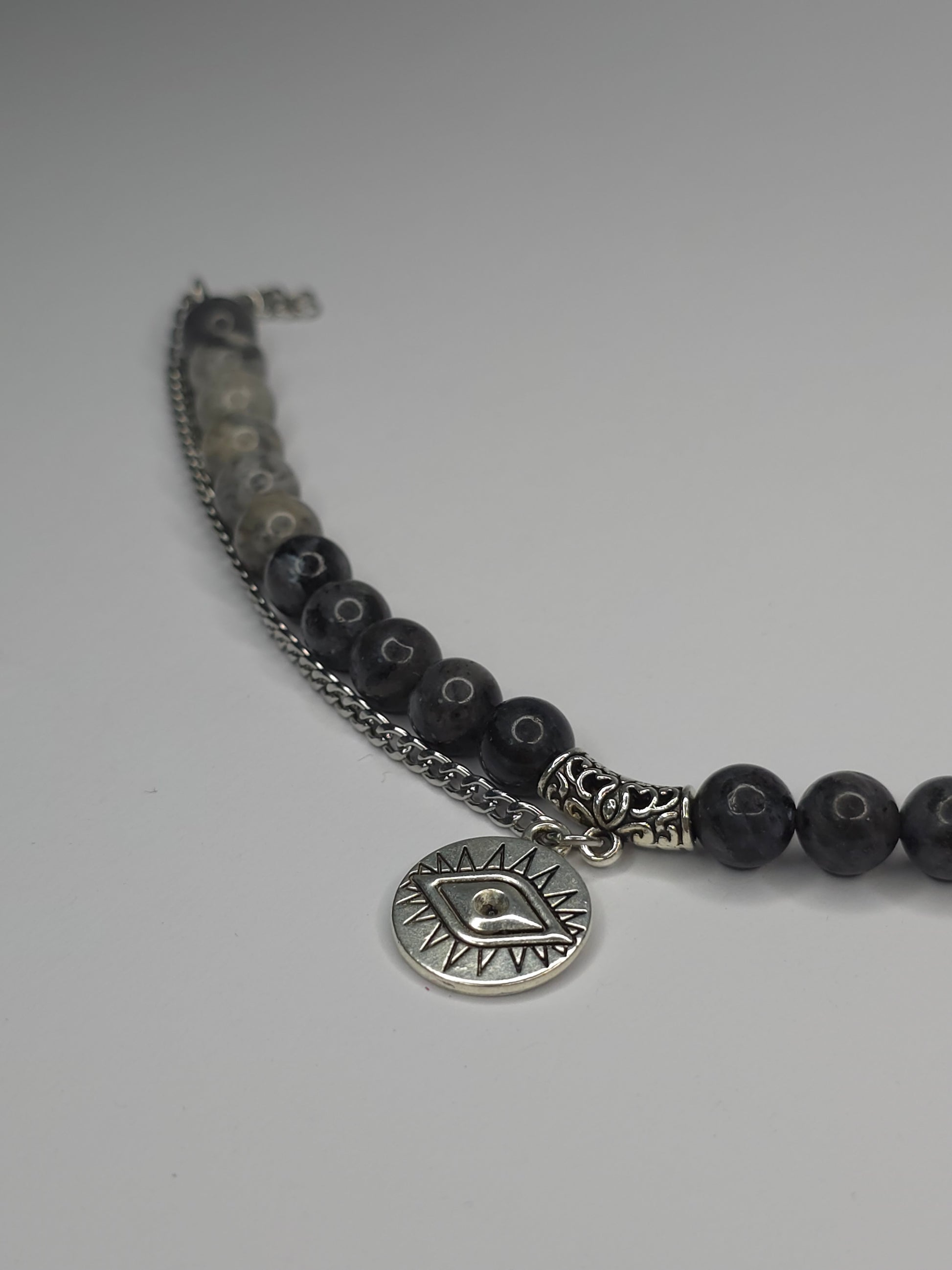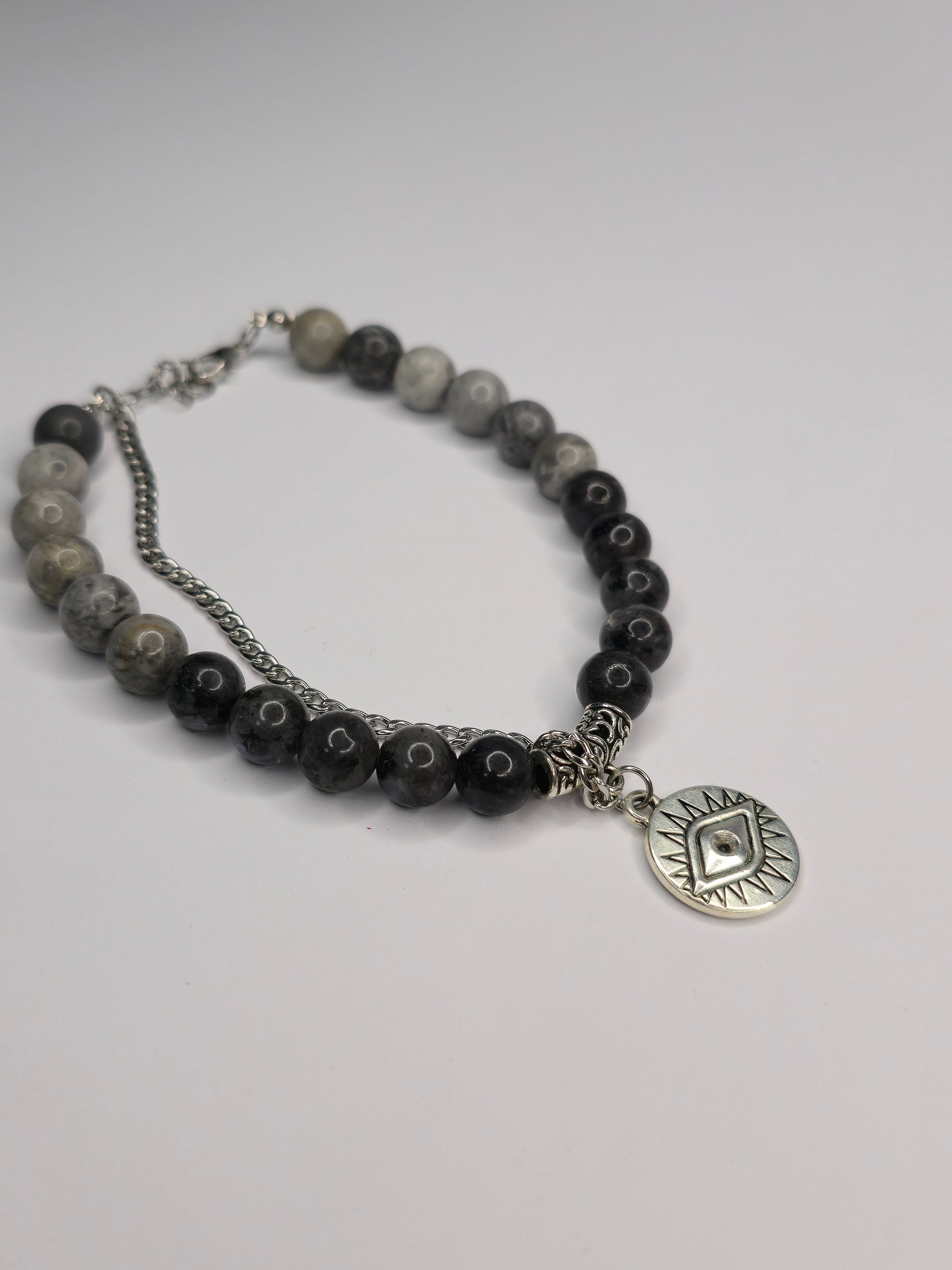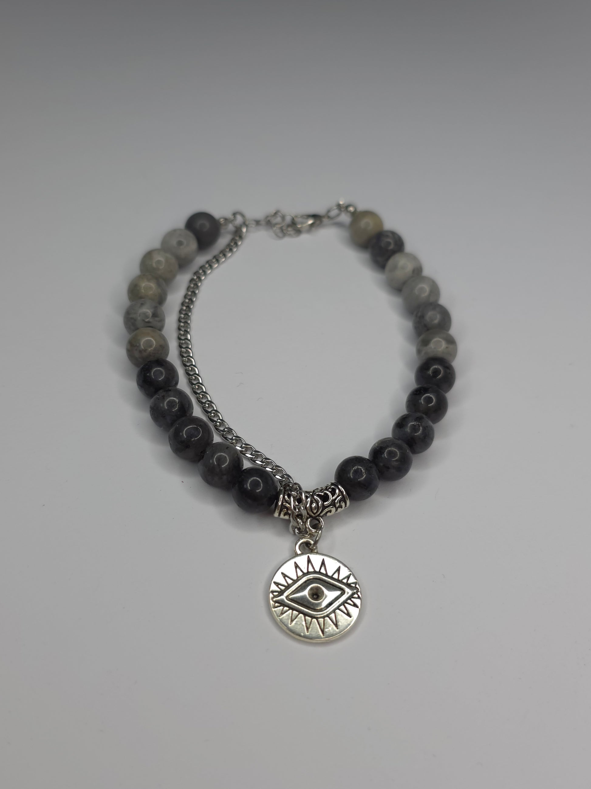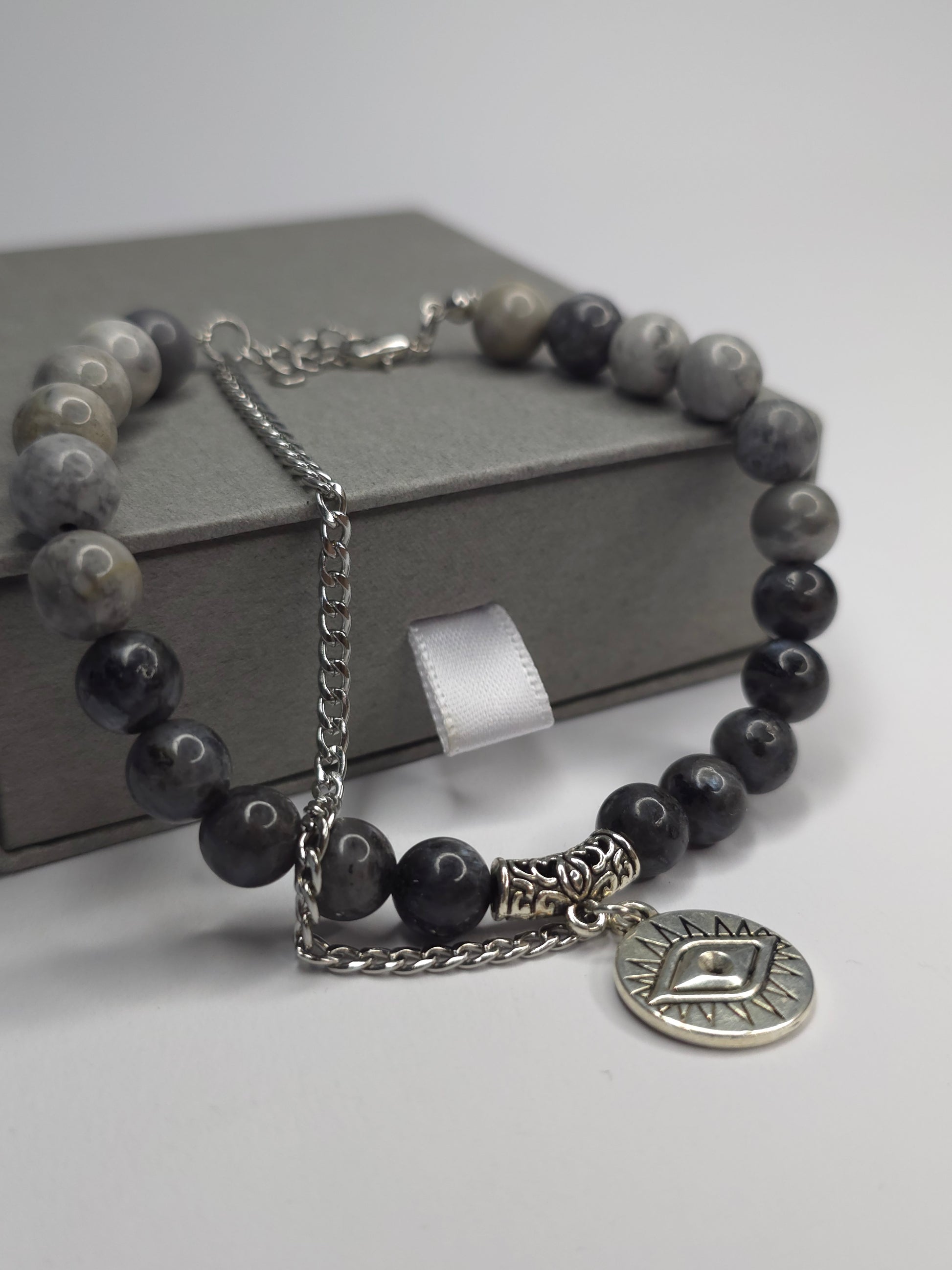 Mystic Eyein ist ein einzigartiges Armband aus polierten Natursteinperlen in Grautönen, kombiniert mit kunstvoll verzierten Silberelementen. Im Mittelpunkt steht ein runder Anhänger mit dem Symbol des schützenden Auges-ein zeitloses Zeichen für Energie, Achtsamkeit und Balance.